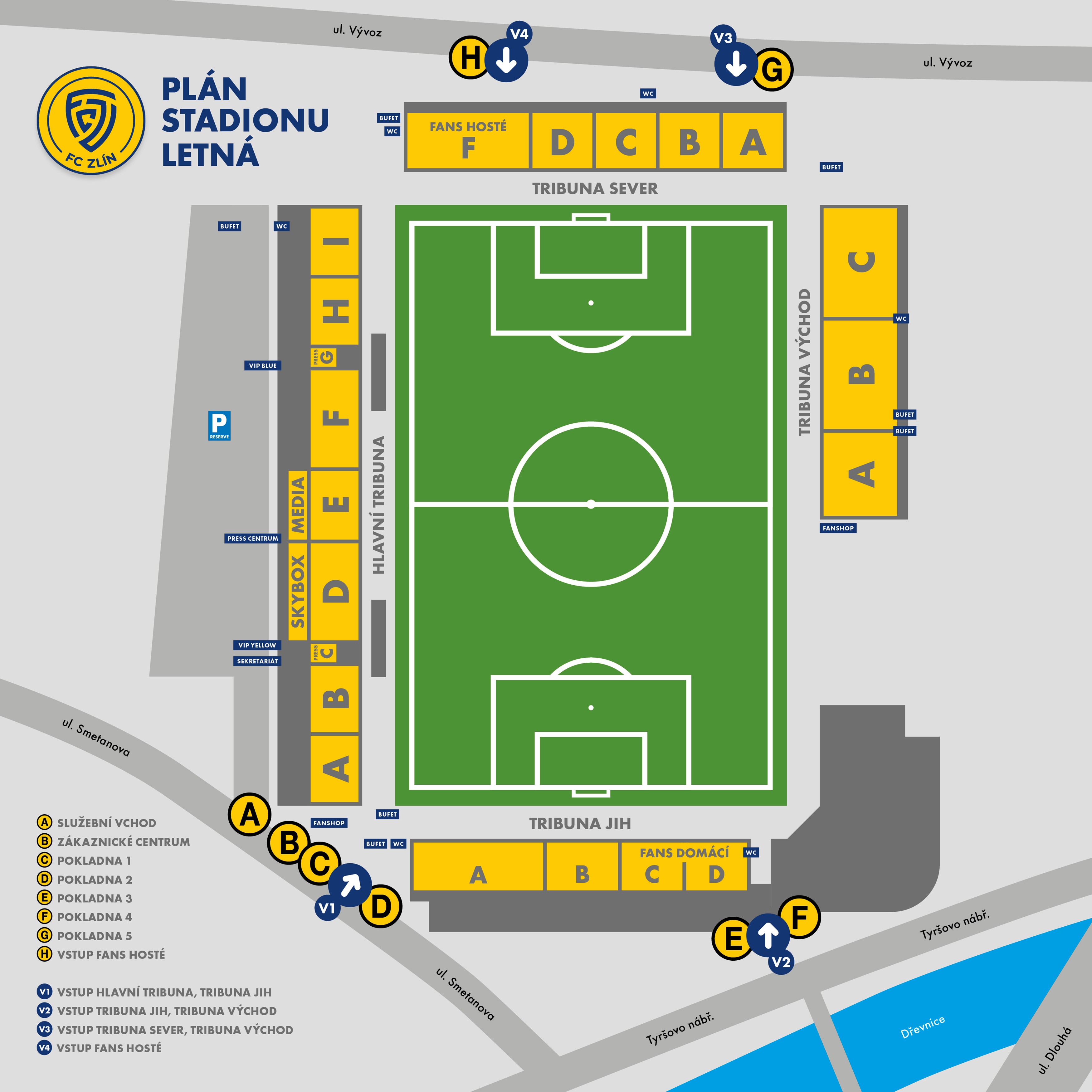 Před příchodem na stadion doporučujeme nastudovat návštěvní řád. Do sektoru hostů se dostanete přes ulici Vývoz, sektor F na Severní tribuně.